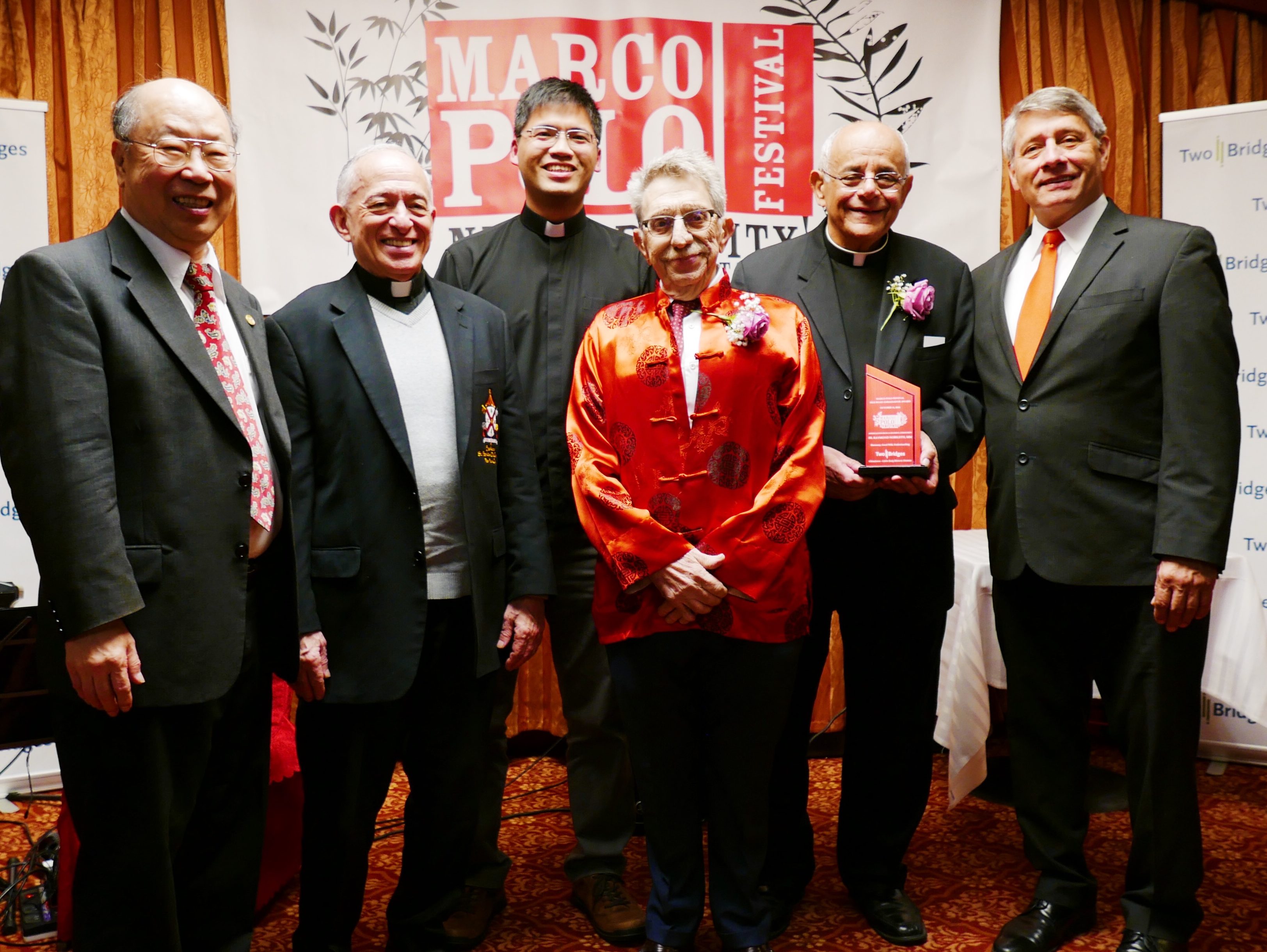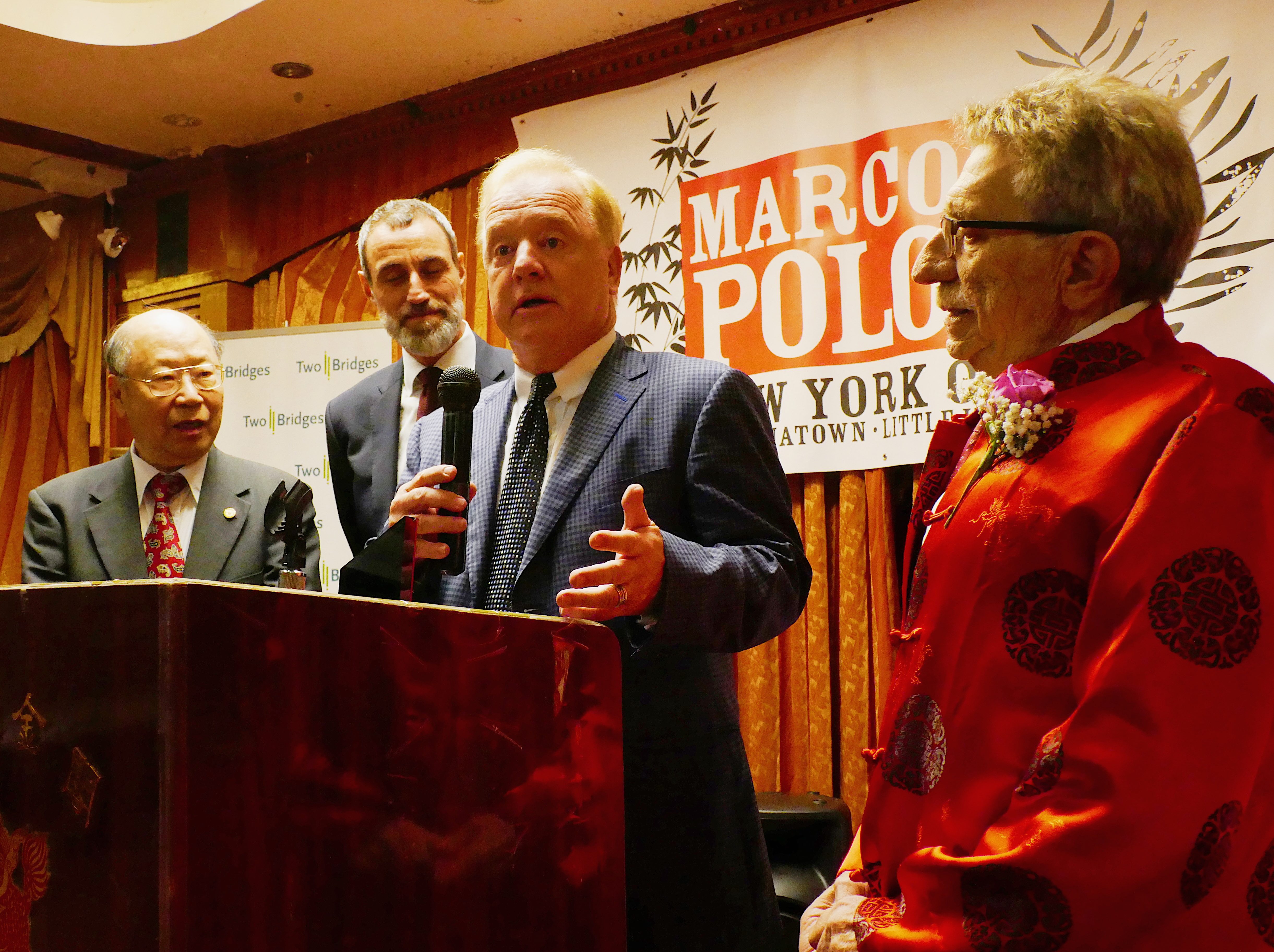 This year’s dinner festivities included the bestowal of the Marco Polo Silk Road Ambassador Awards, where local leaders were honored in recognition of their outstanding contributions towards the promotion of harmony, goodwill, and cooperation of the two communities of Chinatown and Little Italy. The Honorees were: John C. Liu, 43rd New York City (NYC) Comptroller, a 2013 NYC mayoral candidate and current candidate for NY State Senate; and posthumously: Jerry Gottesman, of Edison Properties, and Annette Criscitelli, of Da Nico Ristorante. Also acknowledged for his 25 plus years of service to the Chinatown community was Fr. Raymond Nobiletti, retired pastor of Church of the Transfiguration. A scholarship endowment of $500 was bestowed to the students of PS 126 Manhattan Academy of Technology and its prominent Principal Carlos Romero, for its cultural exchange programs.